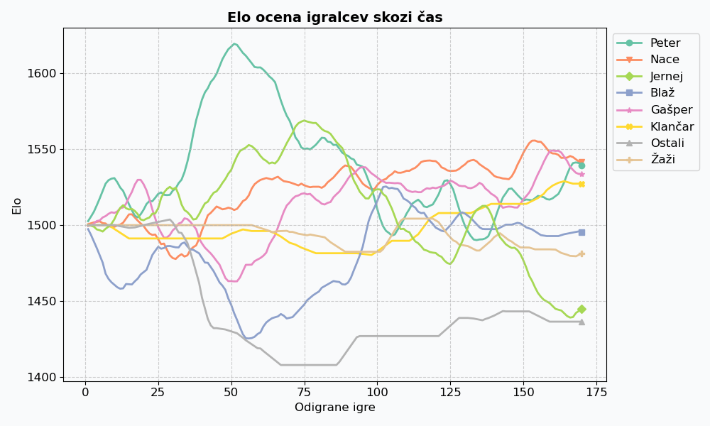 Graf prikazuje spremembe Elo ocene igralcev skozi čas.